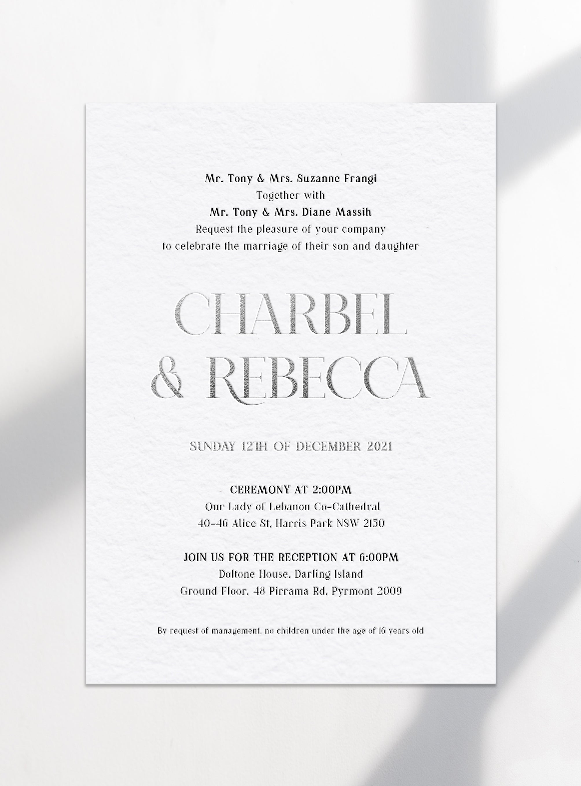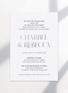 The design pictured is a silver foil and black ink letterpress print on 600gsm cotton paper (main invite), silver foil on 600gsm cotton paper (prewedding card), silver foil and black ink letterpress print on 600gsm cotton paper (RSVP), 120gsm black envelopes with digitally printed guest names and addresses.